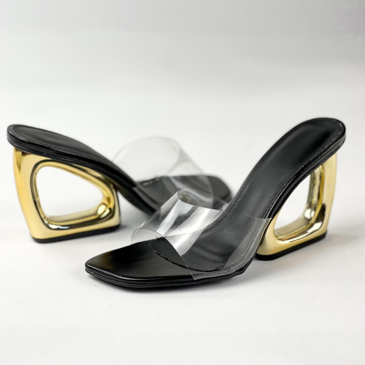 Tamanco preto, salto 9,5 cm com cabedal em vinil.
