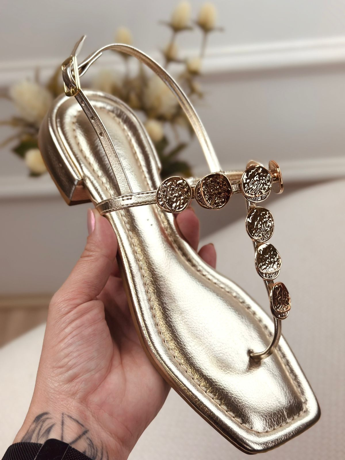 Rasteira dourada, palmilha alcochoada, salto 3 cm.