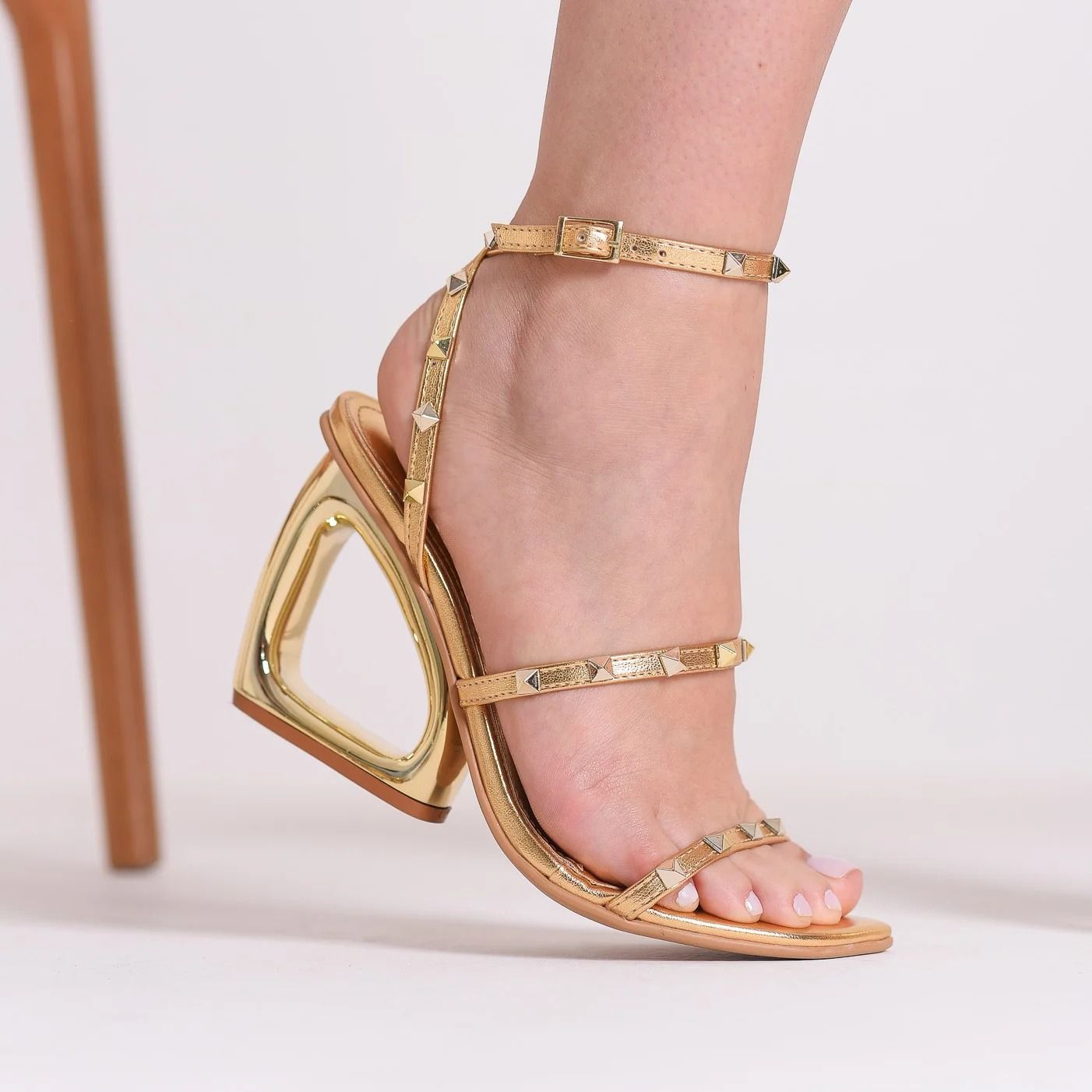 Sandália Ouro light com spikes dourados, salto 9 cm.
