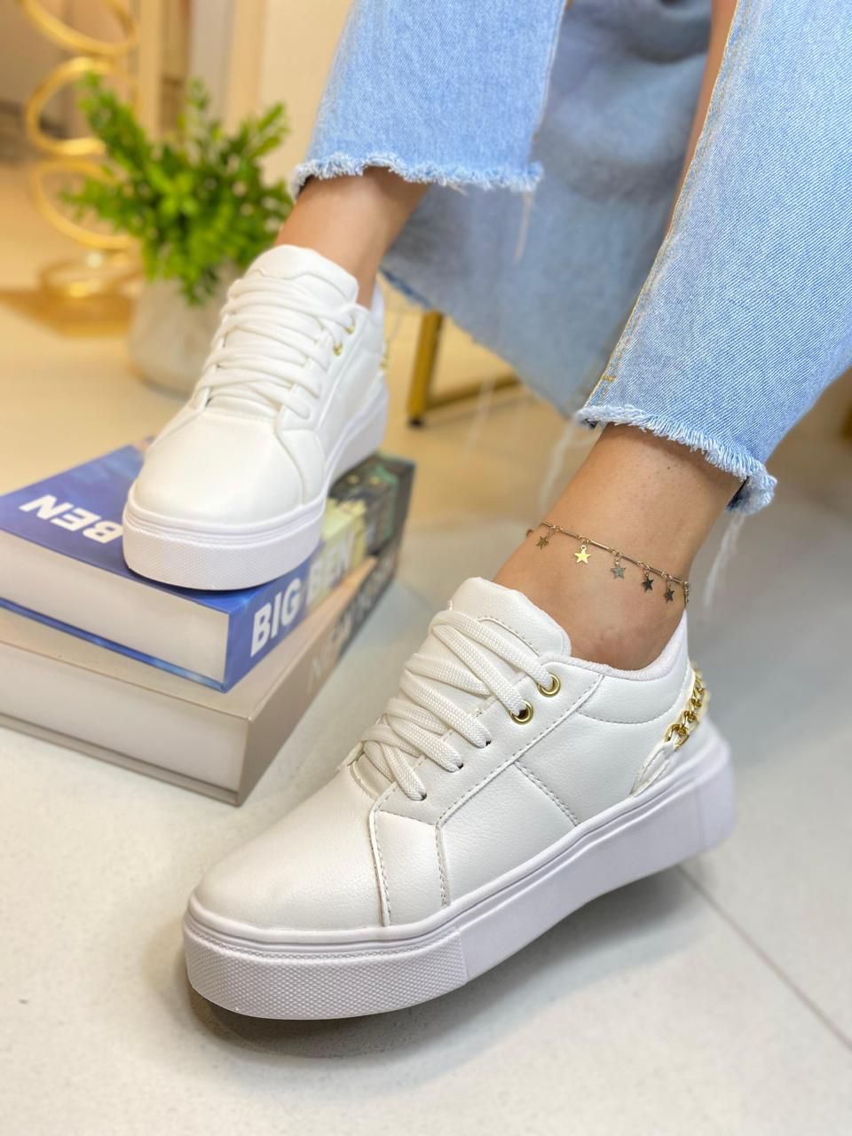 Tênis branco detalhes em corrente dourada