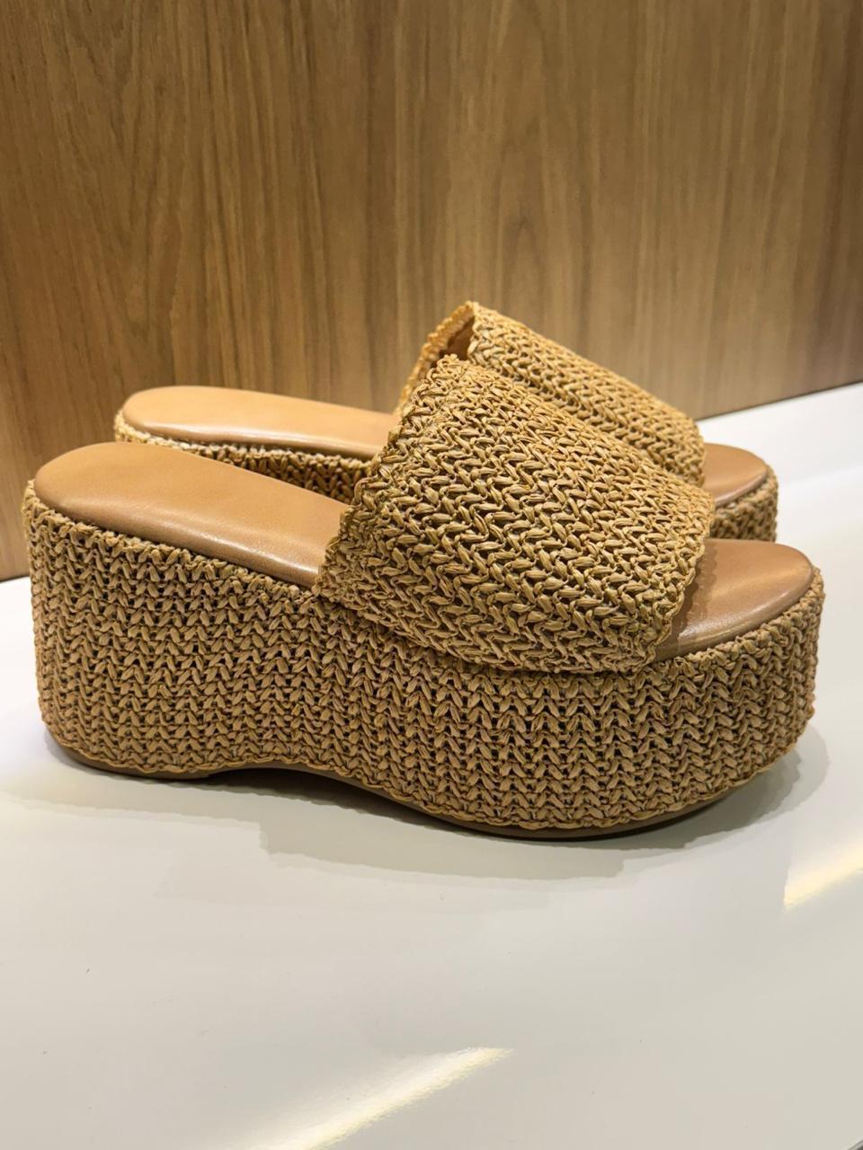 Plataforma palha, palmilha alcochoada e altura 10 cm.